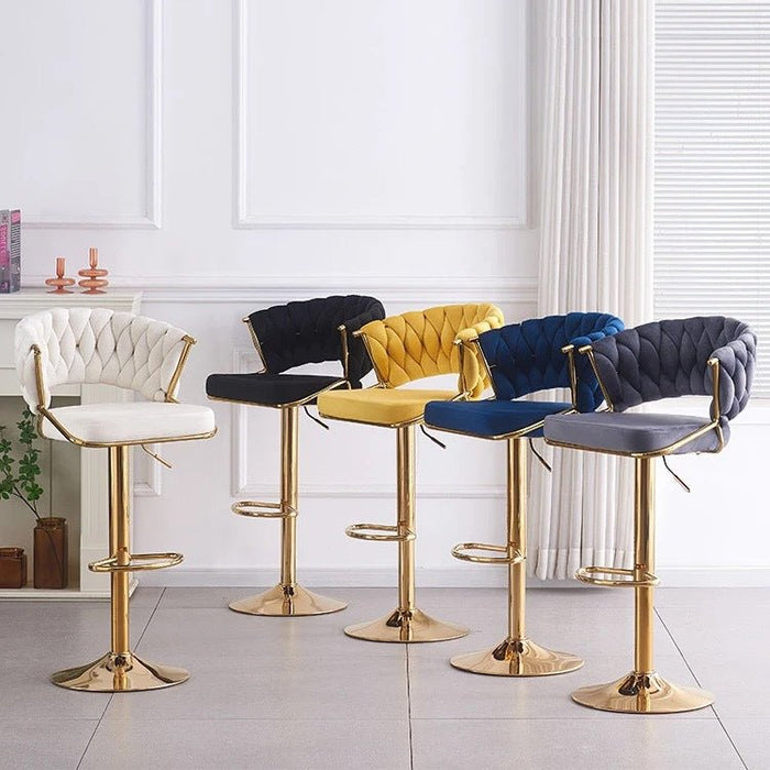 Serenità Designed to blend in with any environment, this bar stool serves the purpose of providing seating comfort along with a neat, simple design. Featuring an elegant woven seat structure and beautiful gold plated gas lift lever, it will surely complement your modern décor. It also incorporates a quality golden plated base with a velvet padded seat providing long lasting furniture that offers maximum comfort. Contemporary and innovative, it's a beauty with assured quality.