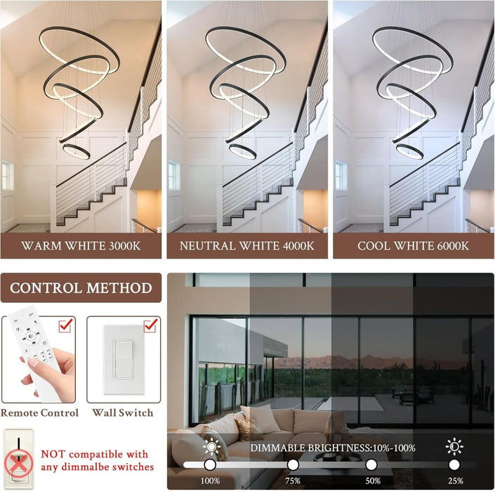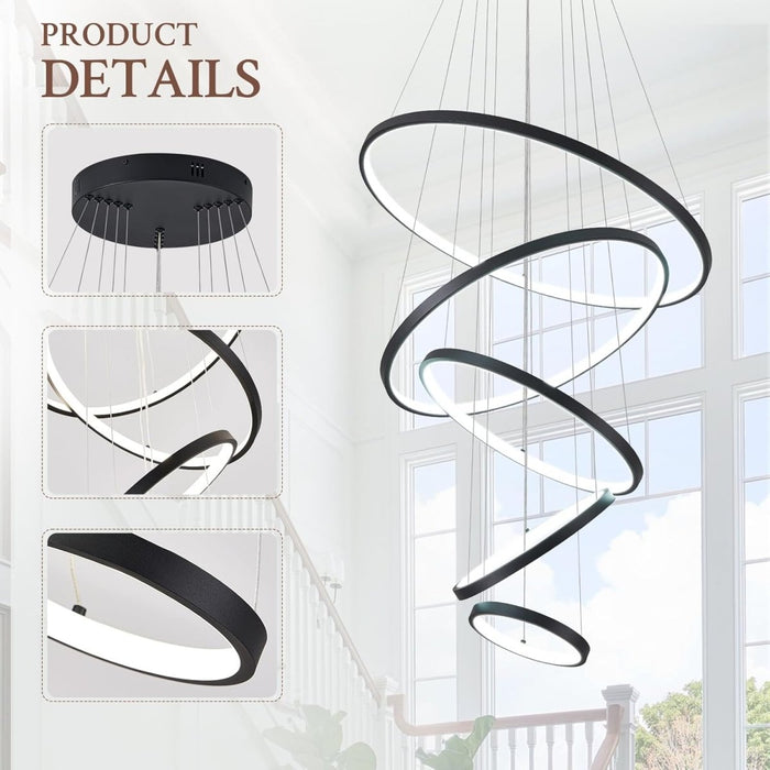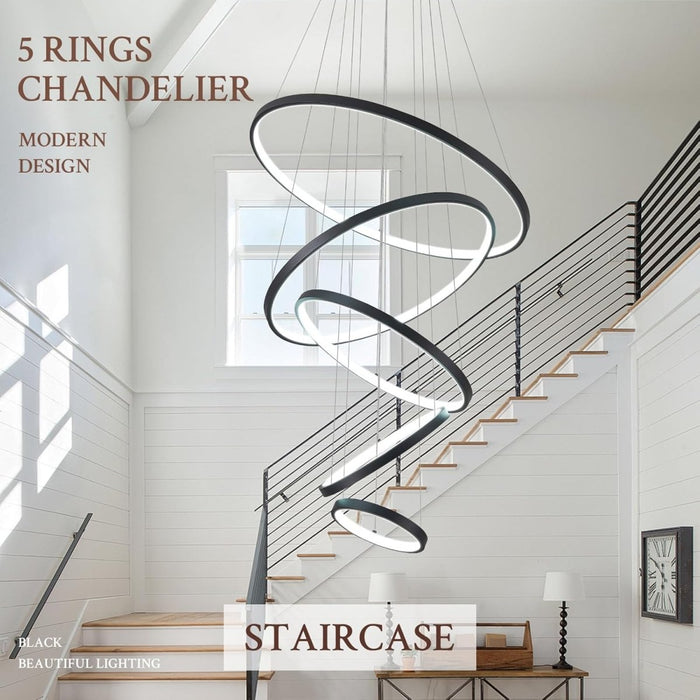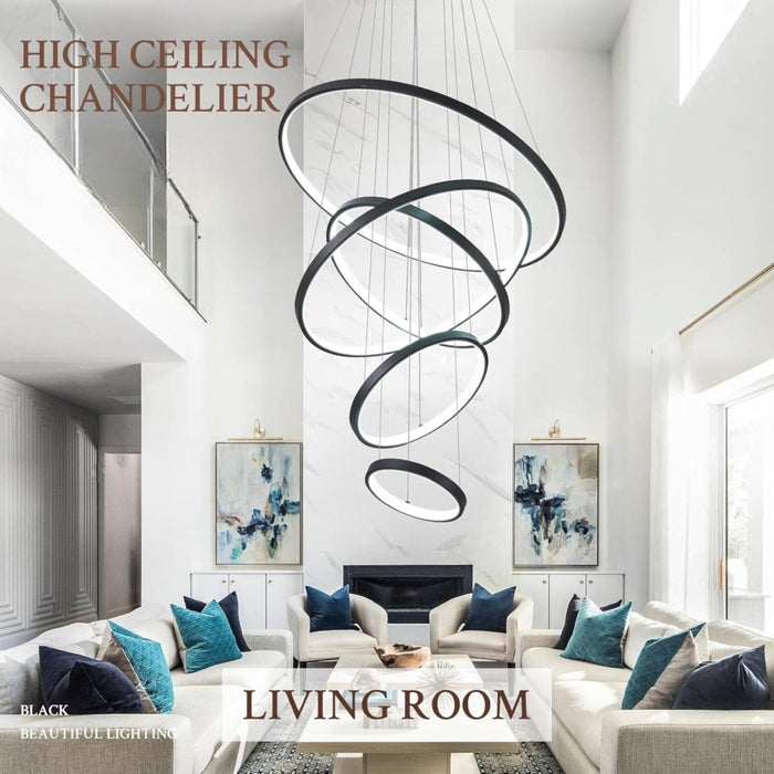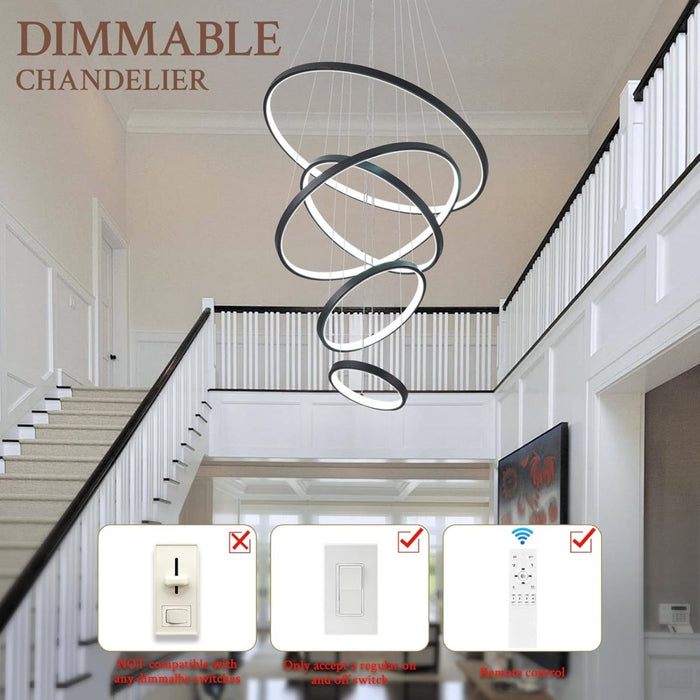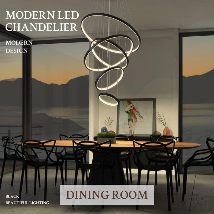 BAMDECOR A18801 Modern LED Chandelier, Dimmable Pendant Light with Remote Control Rings Round Ceiling Lighting Fixture 3 Color Temperatures Contemporary Chandeliers (5 Rings-Black)