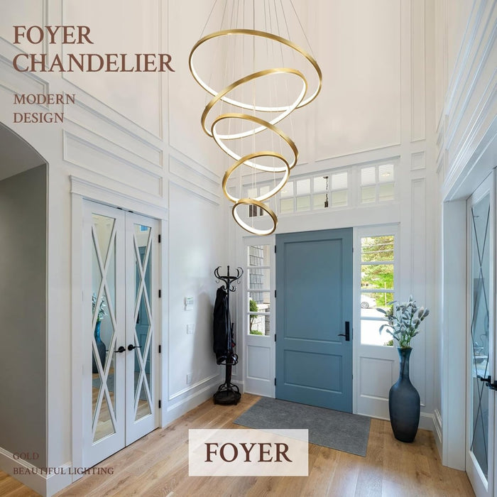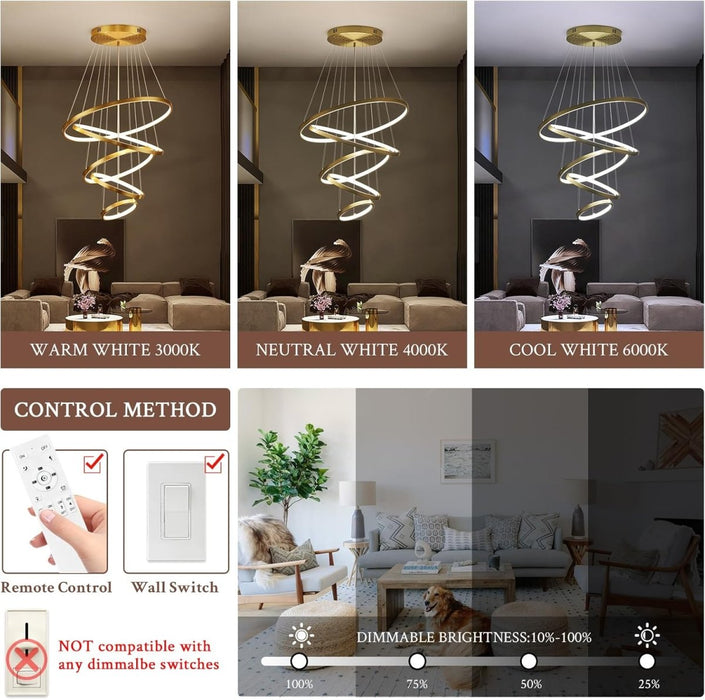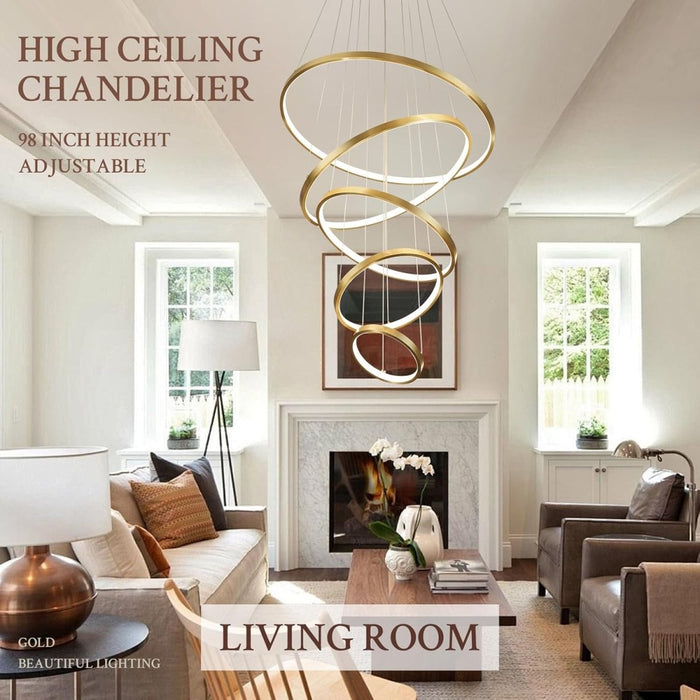 BAMDECOR A18801 Modern LED Chandelier, Dimmable Pendant Light with Remote Control Rings Round Ceiling Lighting Fixture 3 Color Temperatures Contemporary Chandeliers (5 Rings-Gold)