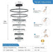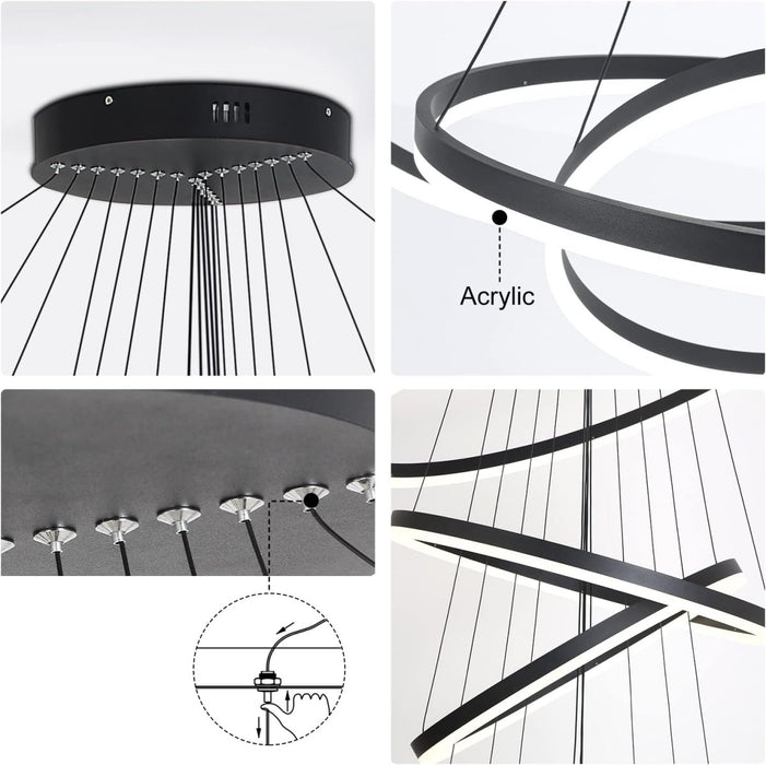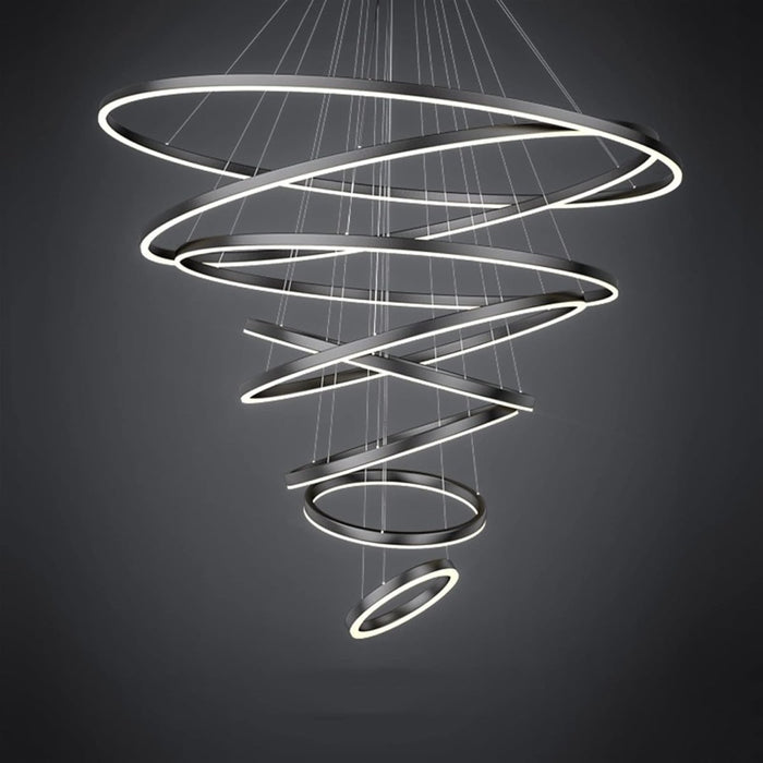 - Modern 7-Rings LED Chandelier: This large 7-rings chandelier is crafted with a meticulous blend of form and function. This contemporary chandelier showcases a striking six-ring design. Constructed from premium aluminum, metal, and acrylic, it incorporates durability and aesthetic appeal. The chandelier's energy-efficient LED lighting blends harmoniously into its sleek circular frame, creating a captivating focal point for any modern interior.