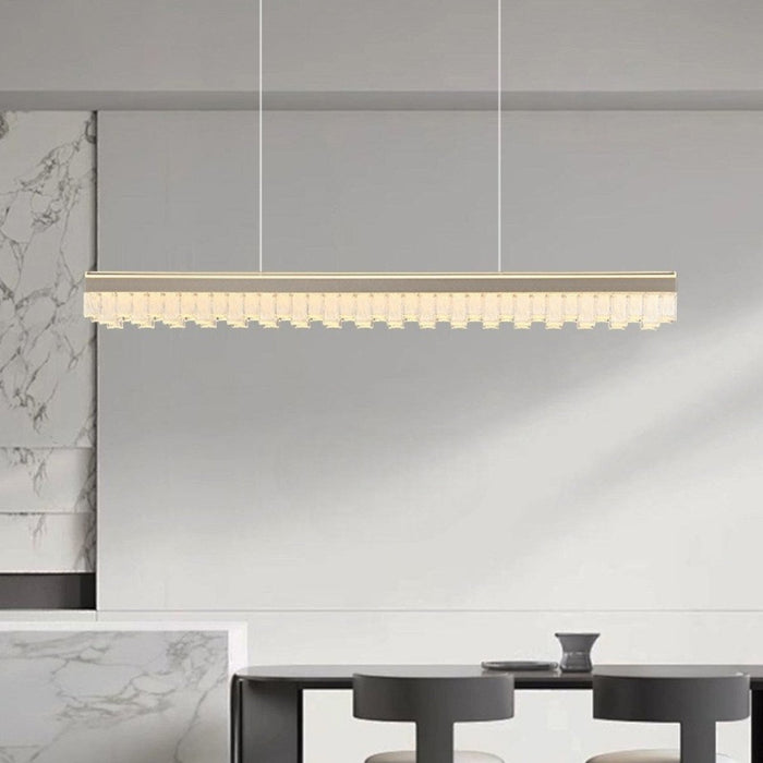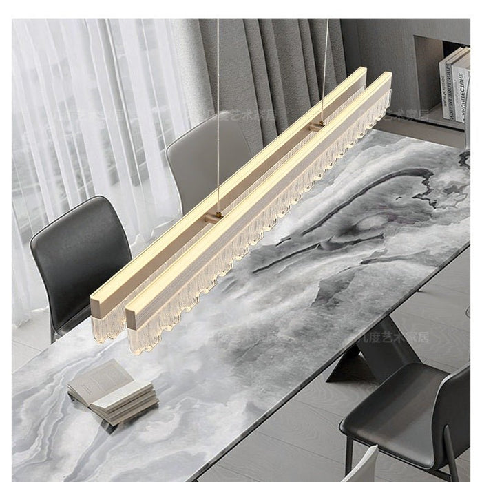 - This stunning piece of minimalist pendant lighting combines sleek lines and modern aesthetics, making it a perfect fit for contemporary interiors. Made of high-quality acrylic, the chandelier offers a soft, diffused light that enhances your dining experience while adding a touch of elegance to your space.