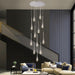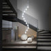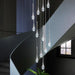 BAMDECOR LT08 is a Modern Multi-Pendant Spiral Chandelier featuring elegant, elongated "raindrop" or "teardrop" crystal elements. Suspended at varying heights from a central canopy, the warm LED lights create a cascading glow that mimics falling water, making it an ideal statement piece for high-ceiling foyers, grand entryways, or spiral staircases.