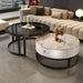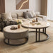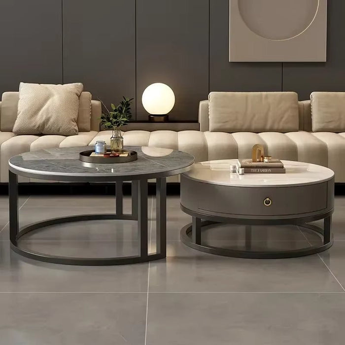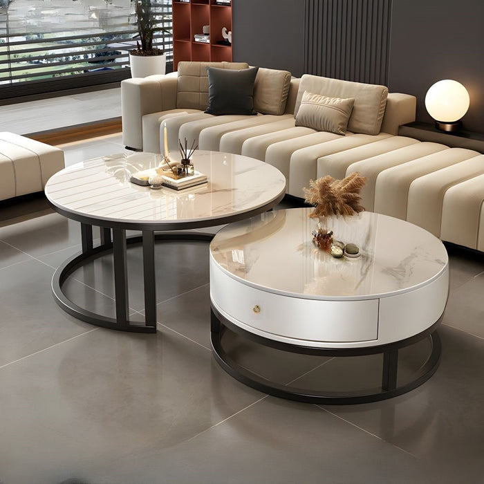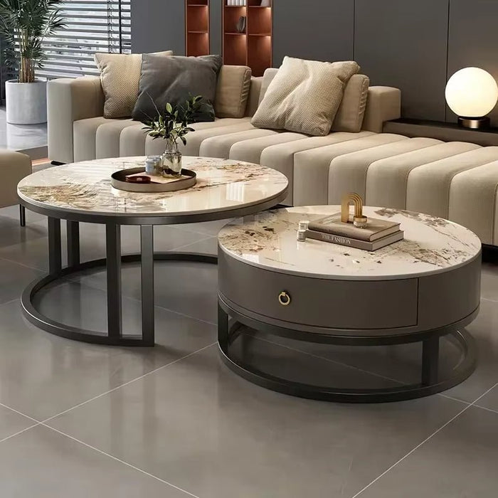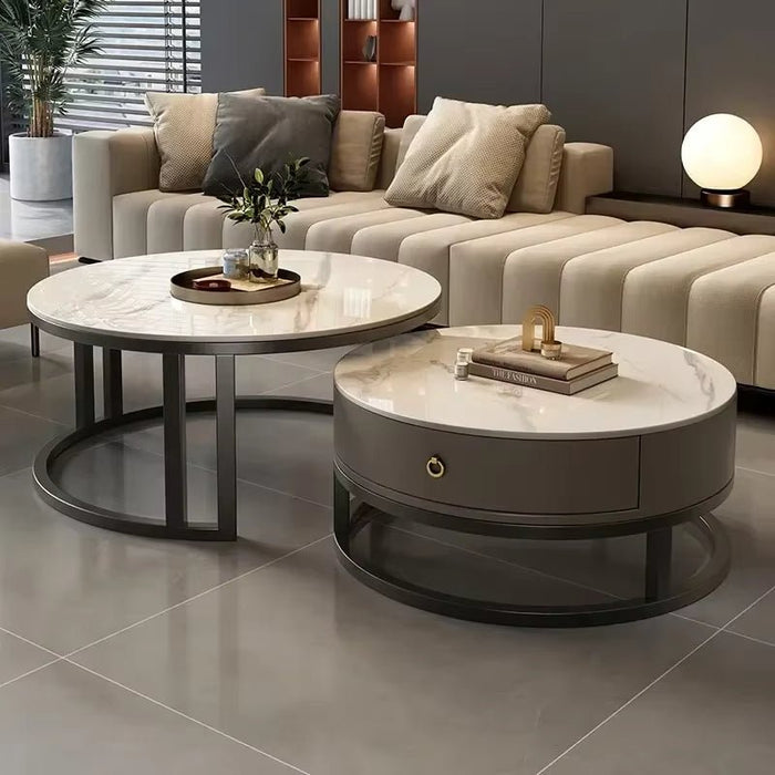 2. Adjustable Nesting Design: Two round tables can be arranged in different positions, with a metal bottom frame and stone top, easy to move around.